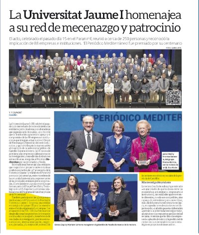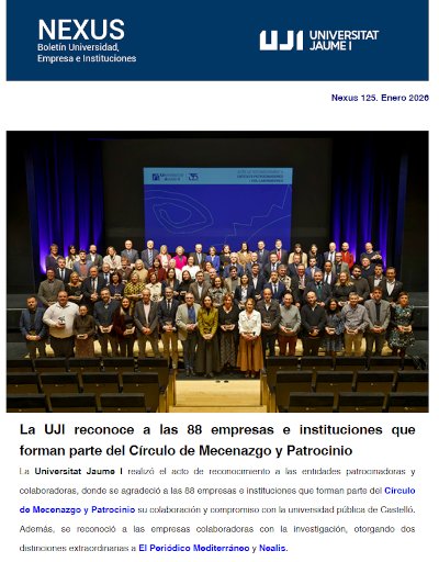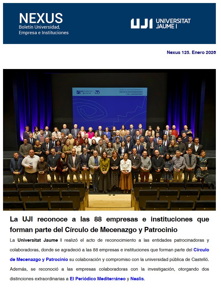 La Universitat Jaume I celebró el jueves 15 de enero el acto de reconocimiento a las entidades patrocinadoras y colaboradoras que organiza cada cinco años, donde agradeció a las 88 empresas e instituciones que forman parte actualmente del Círculo de Mecenazgo y Patrocinio de la UJI su colaboración y compromiso con la universidad pública de Castelló. Además, reconoció a las empresas colaboradoras con la investigación y otorgó dos distinciones extraordinarias: a El Periódico Mediterráneo y a Nealis.