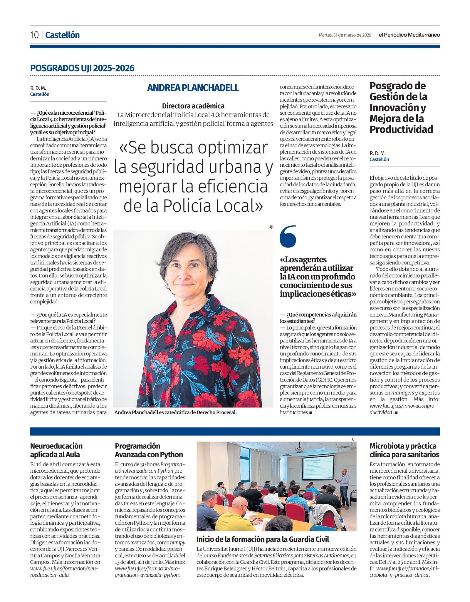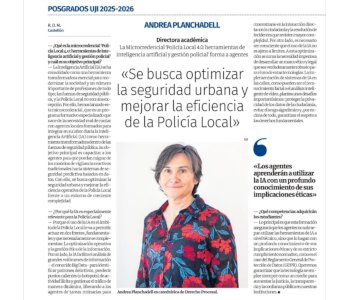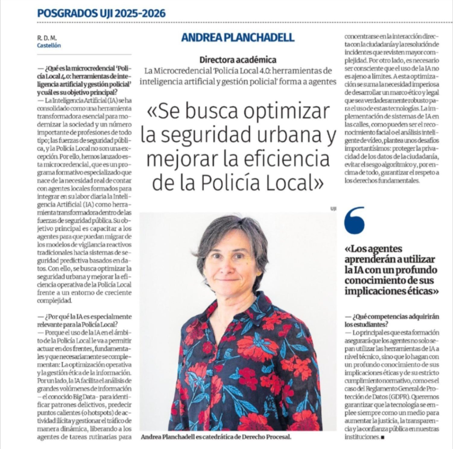 Andrea Planchadell, directora académica de la Microcredencial Universitaria en Policía Local 4.0: herramientas de inteligencia artificial y gestión policial, que dio inicio el 17 de marzo en el marco del Plan Microcreds UJI, ha sido entrevistada por el periódico Mediterráneo con motivo de la puesta en marcha de esta formación especializada.