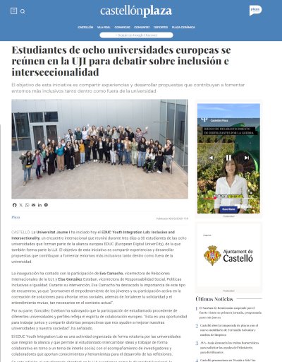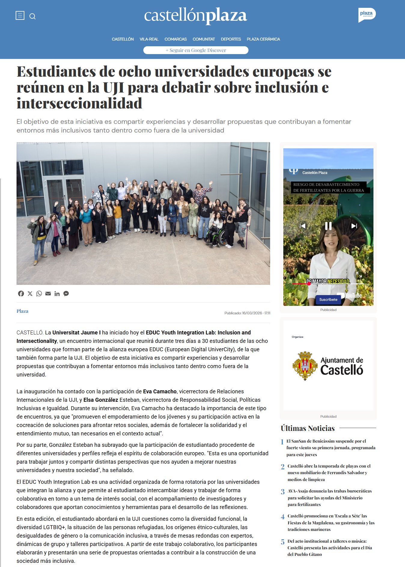 La Universitat Jaume I inauguró recientemente el EDUC Youth Integration Lab: Inclusion and Intersectionality, un encuentro internacional que reunió durante tres días a 30 estudiantes de las ocho universidades que forman parte de la alianza europea EDUC (European Digital UniverCity), de la que también forma parte la UJI.
